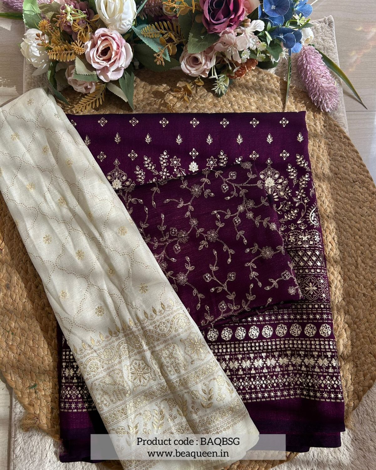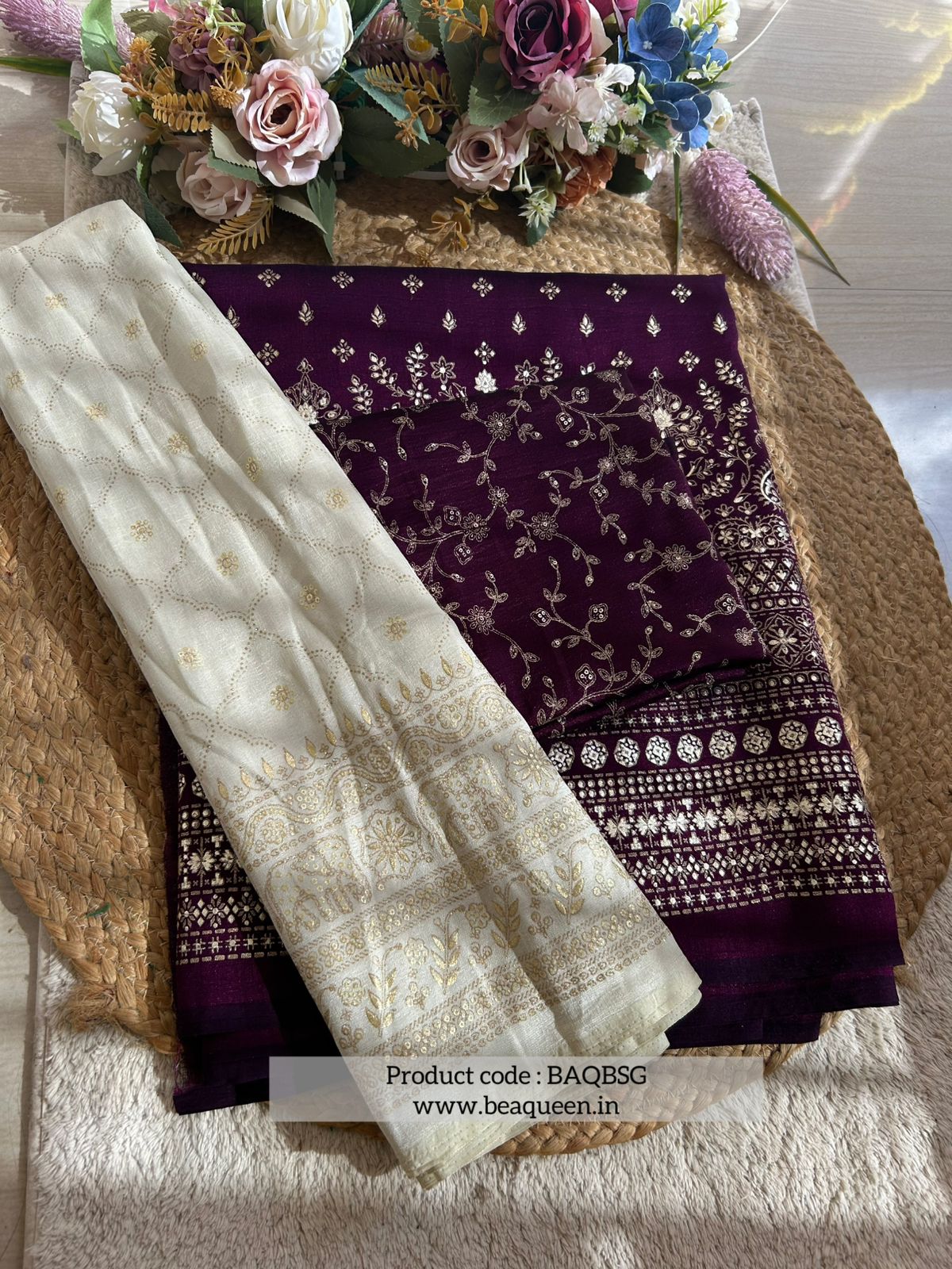 FULLY UNSTITCHED DARK PURPLE, OFF WHITE HALFSAREE FABRIC IN BADRI SILK-BAQBSG