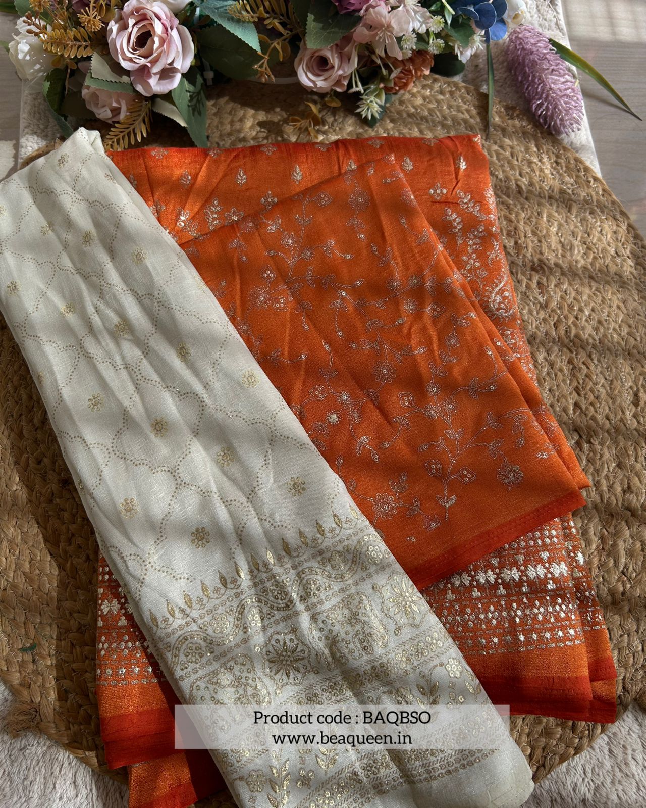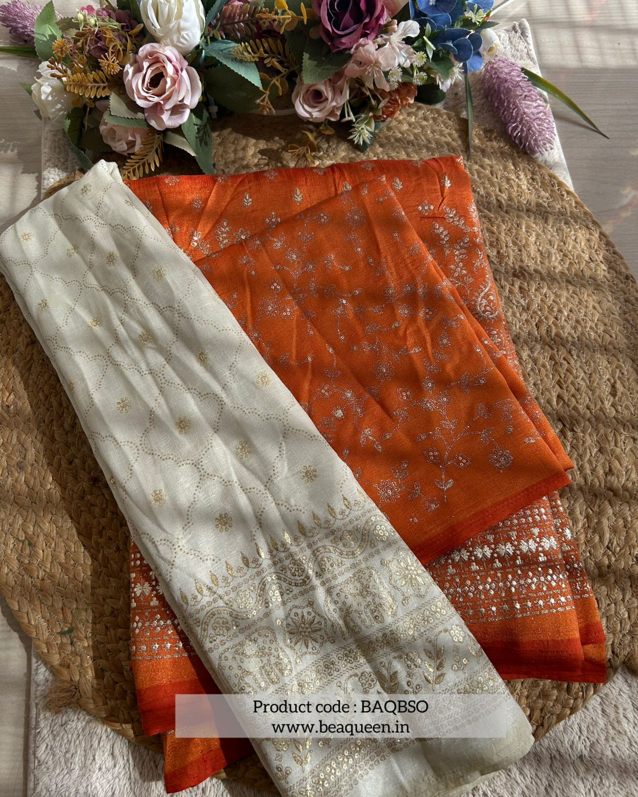 FULLY UNSTITCHED ORANGE, OFF WHITE HALFSAREE FABRIC IN BADRI SILK-BAQBSO