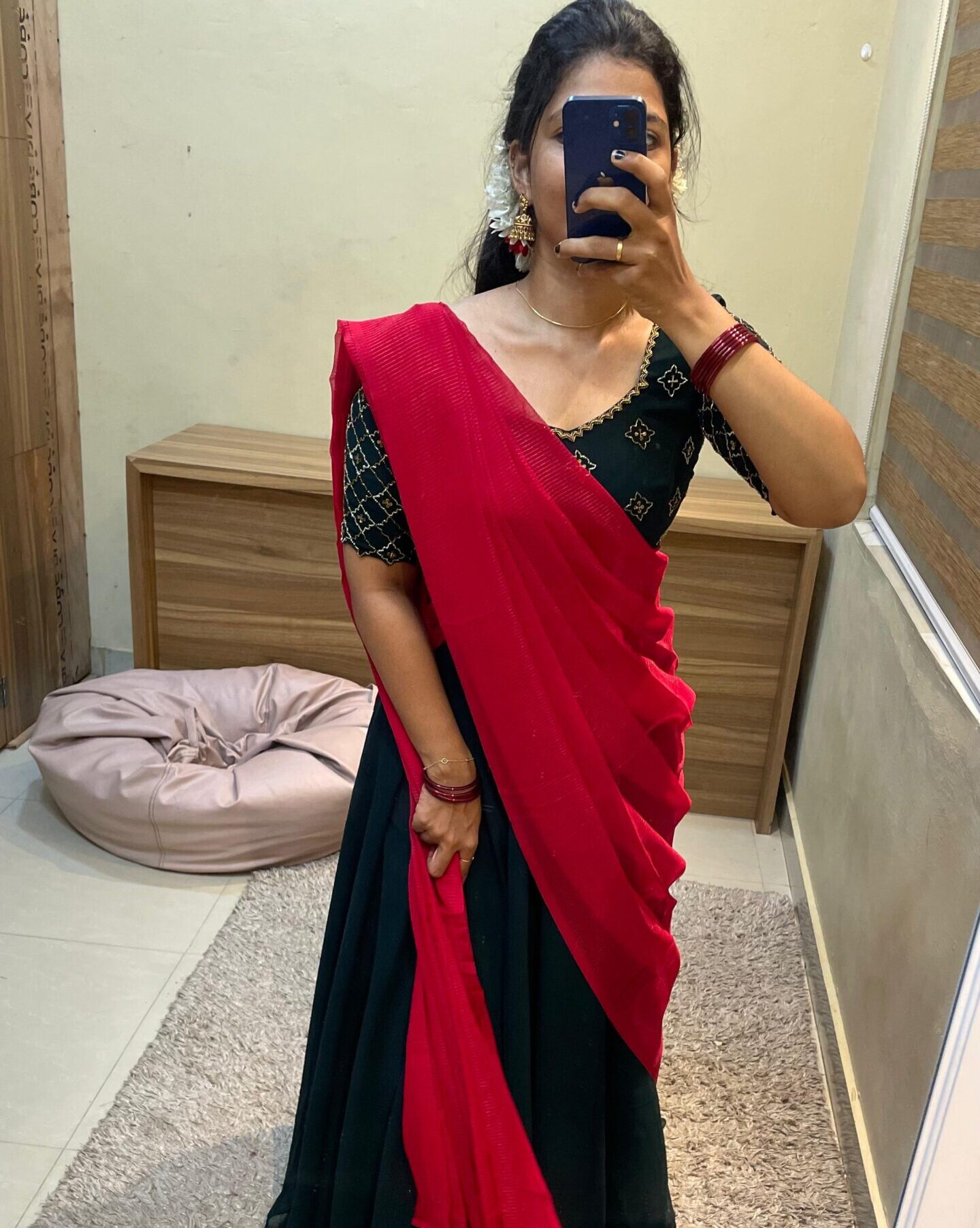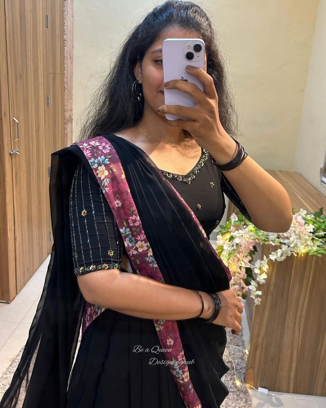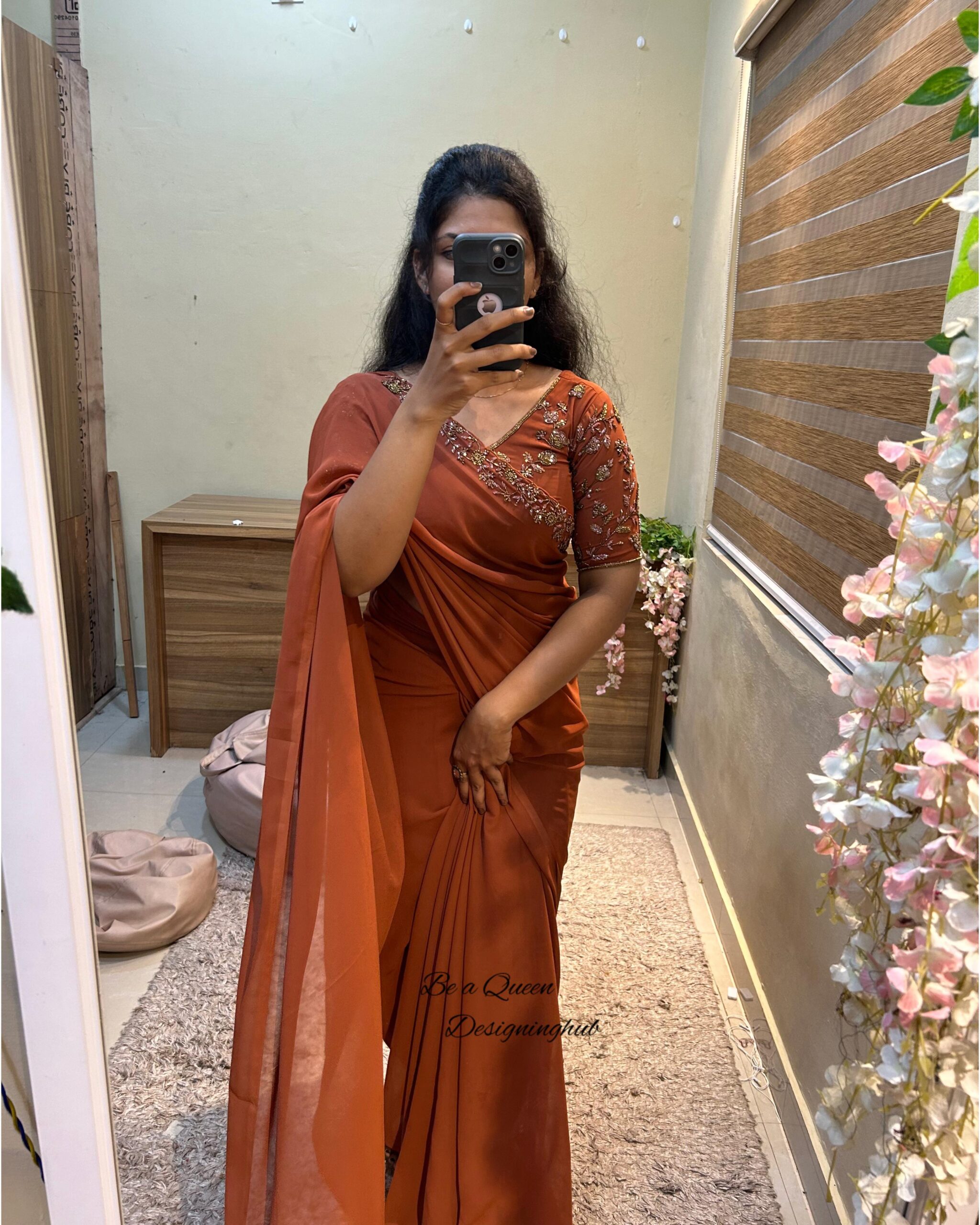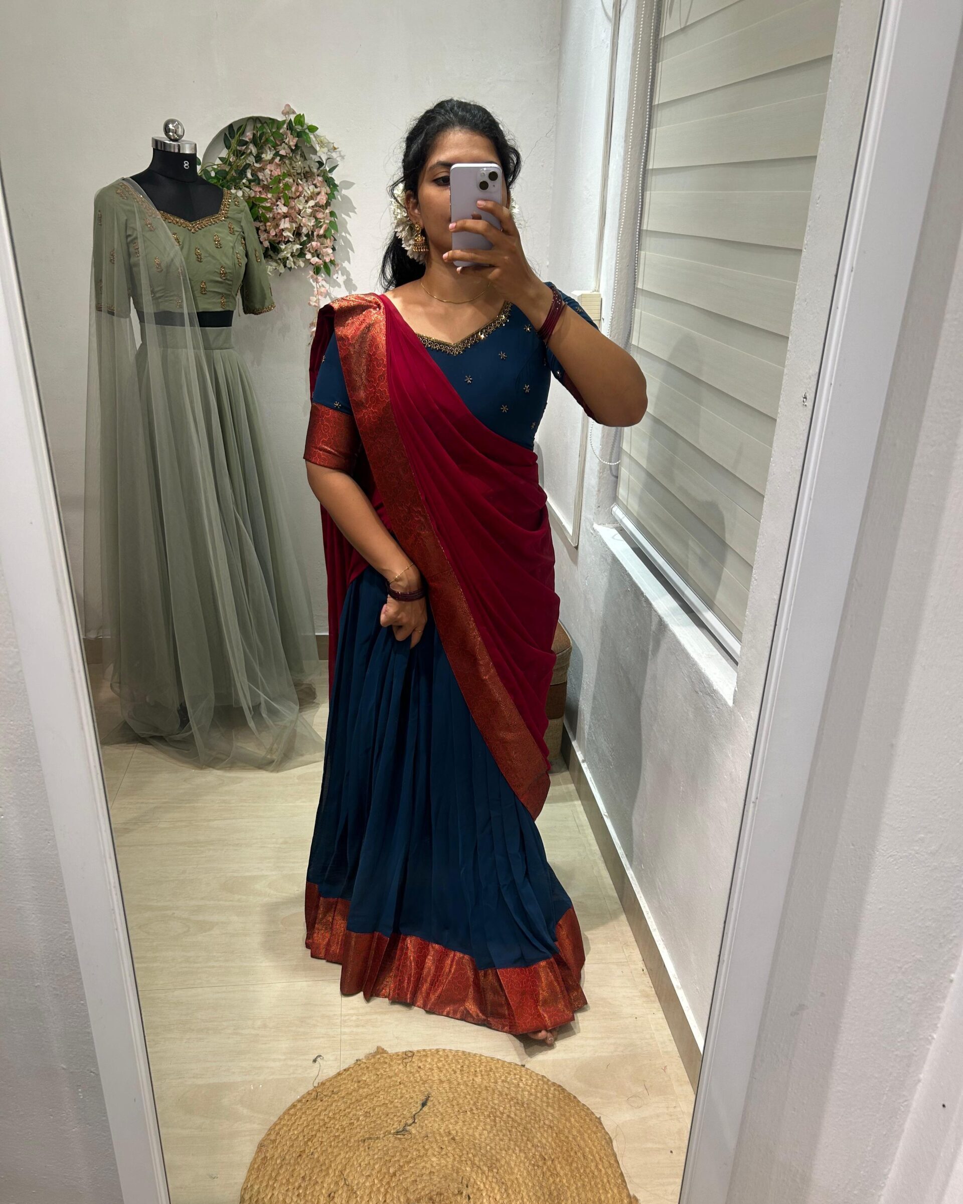 blouse piece with handwork: Georgette silk 1.25 mtr , skirt : Georgette silk; stitched with 5 mtr fabric ; with lining