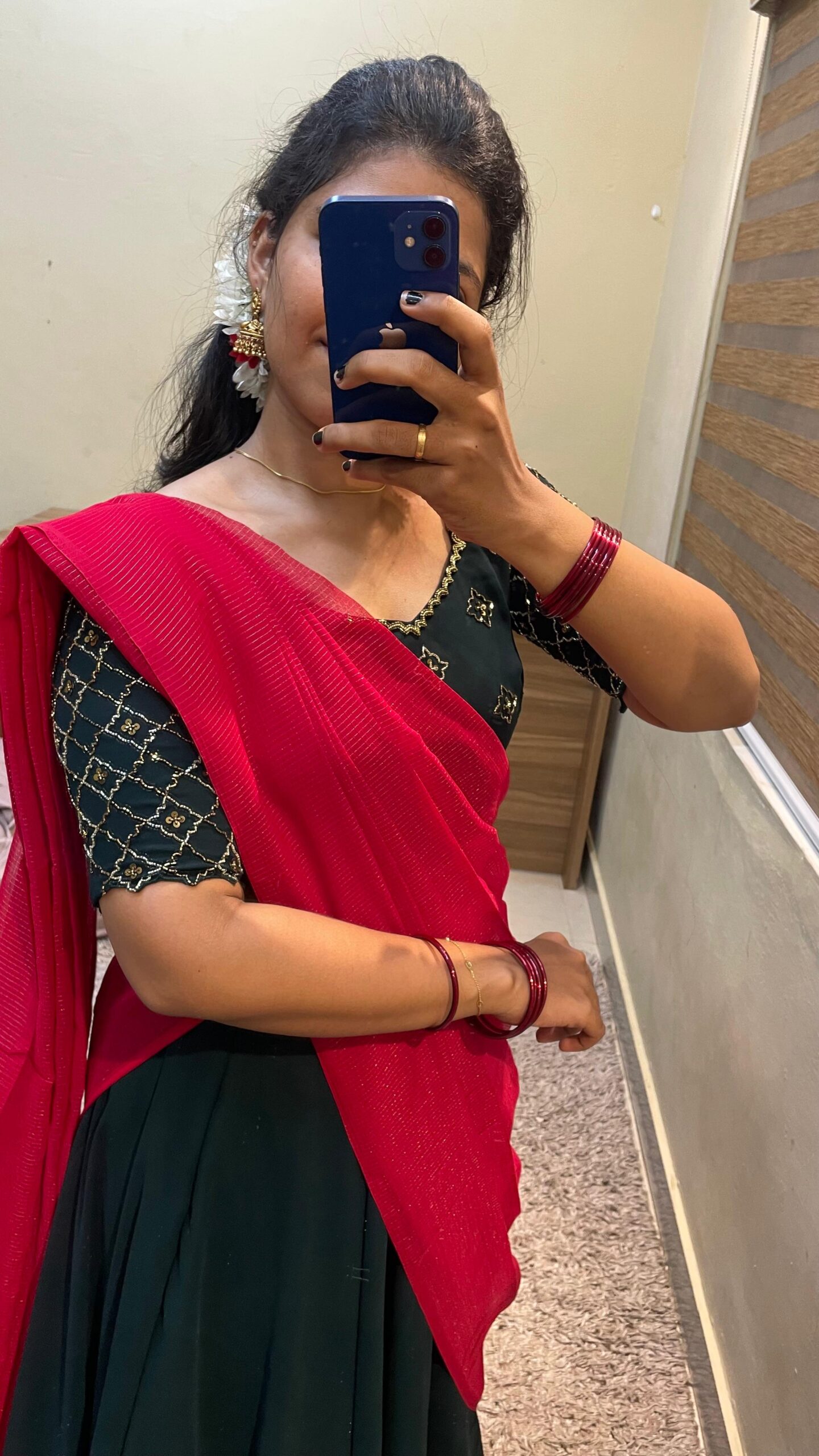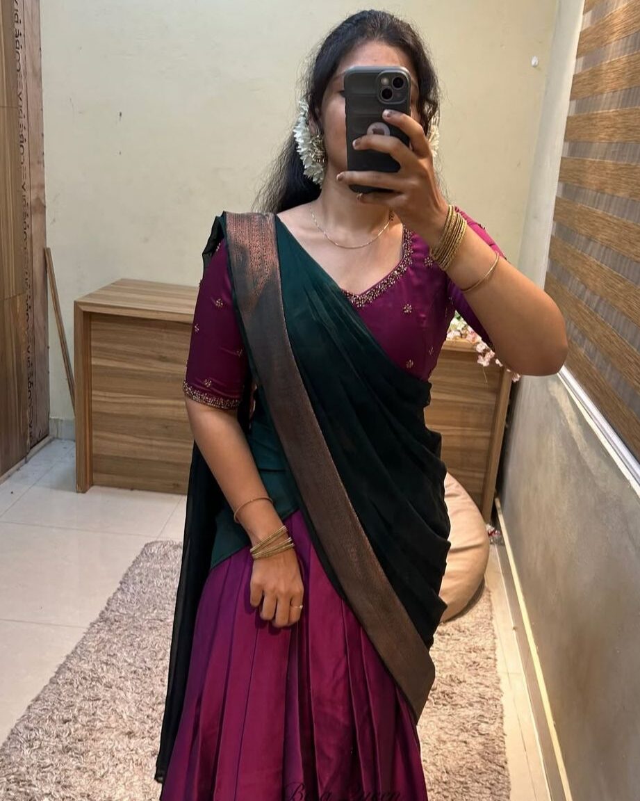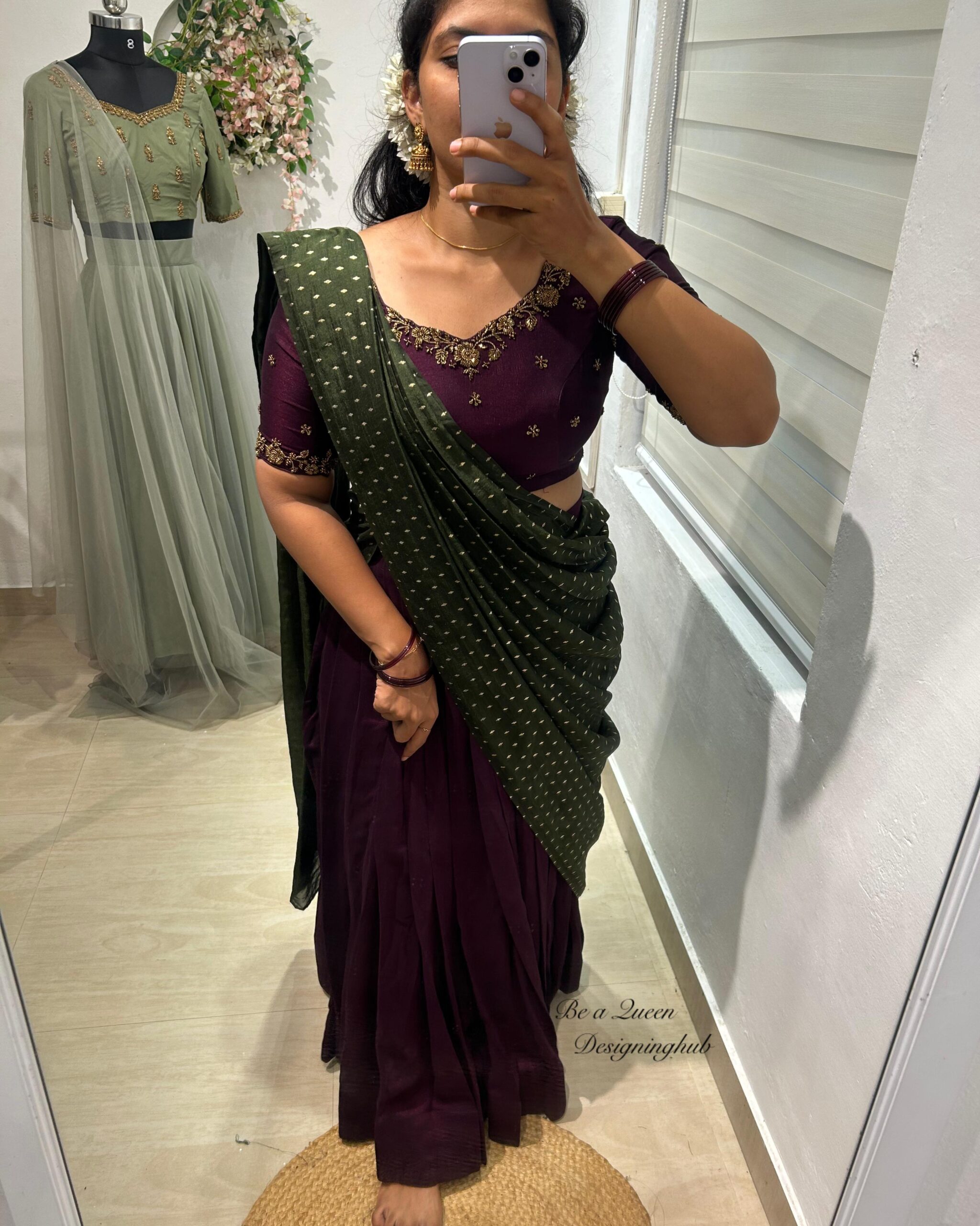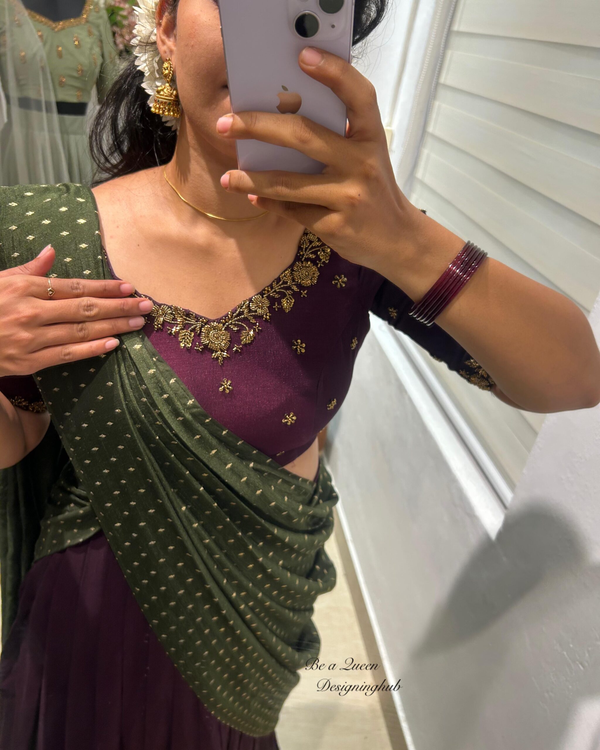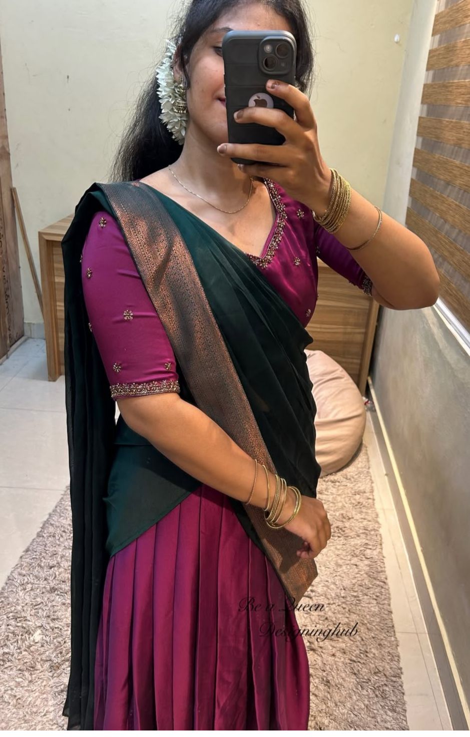 blouse piece with handwork: badri silk 1.25 mtr , skirt : badri silk; stitched with 5 mtr fabric ; with lining