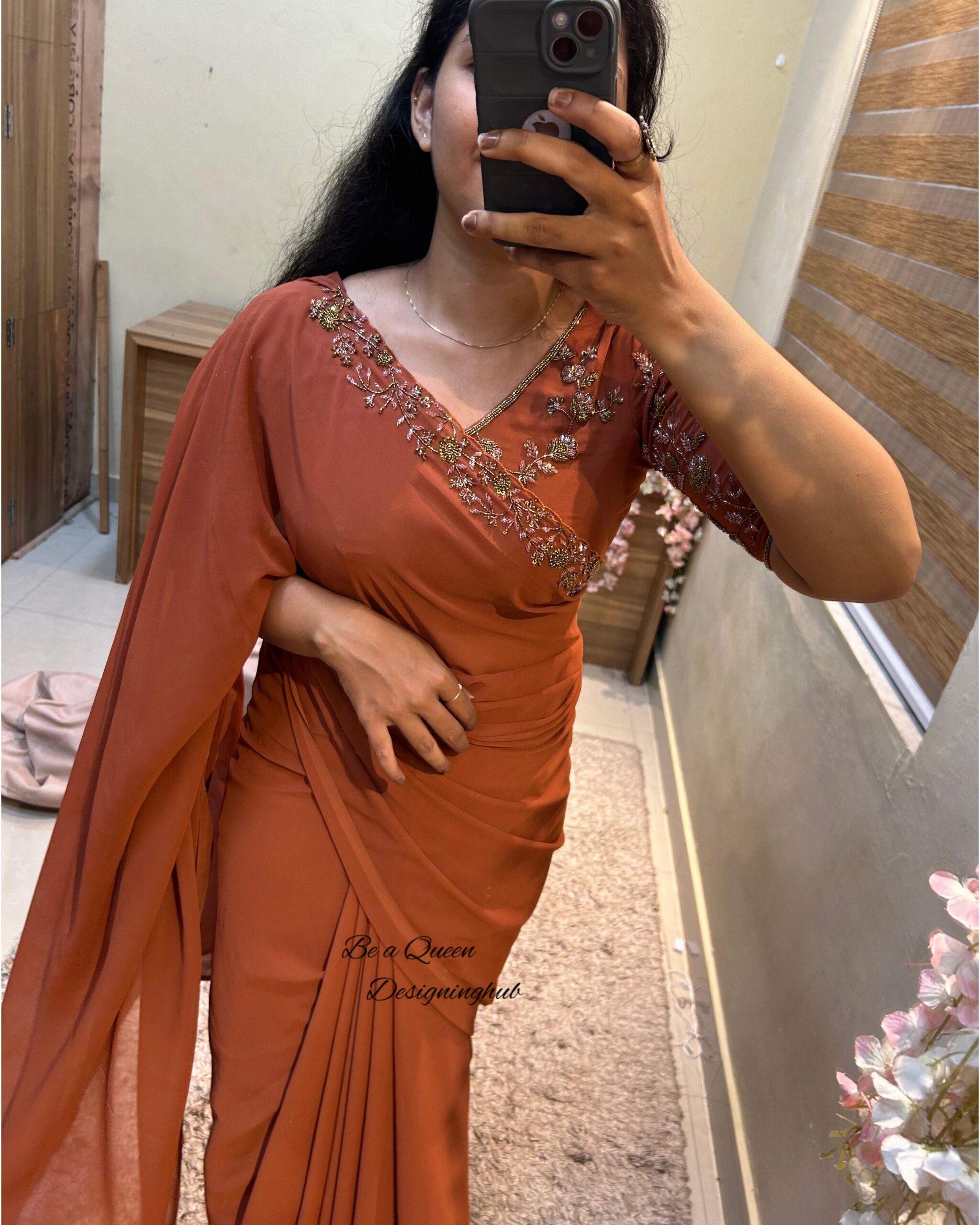 Handworked saree : Georgette 5.5 mtr(handwork on front portion only) , blouse piece with handwork: Georgette 1.25 mtr ( handwork on both sleeves & front body right side)