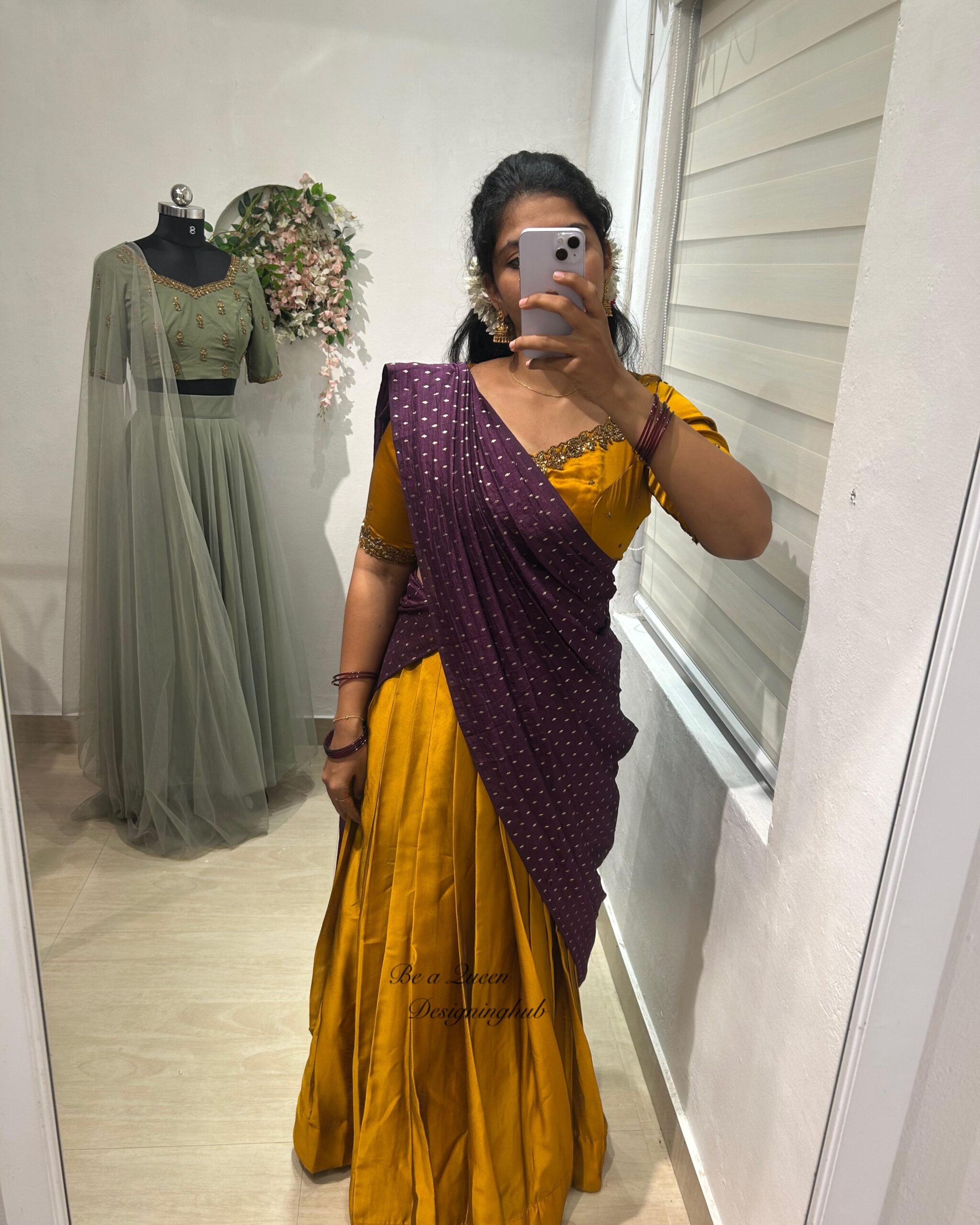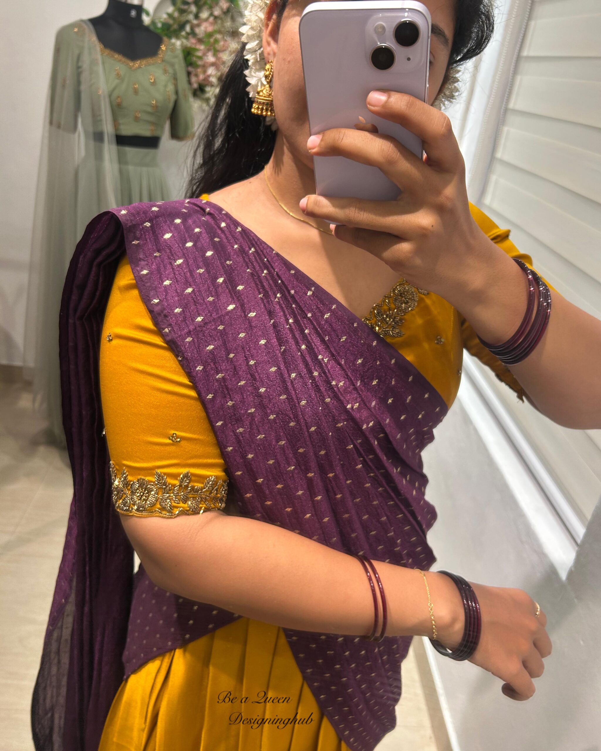 🌸Halfsaree in golden yellow with Dotted purple Duppatta combo 🌸