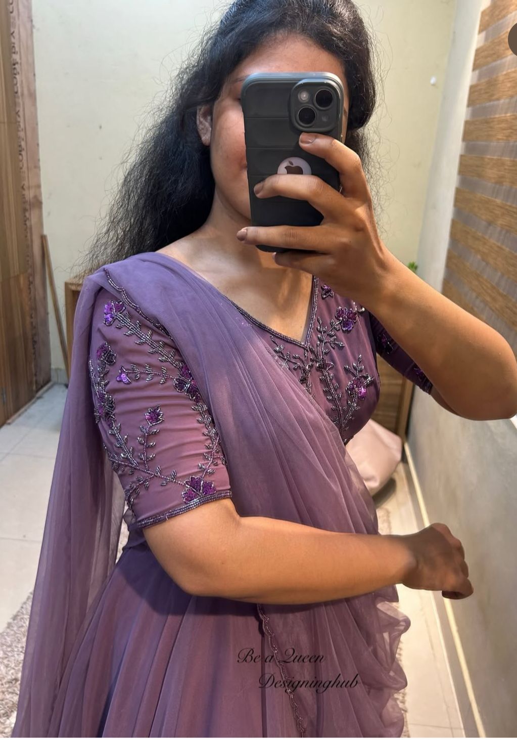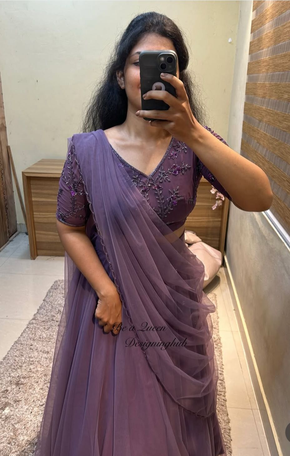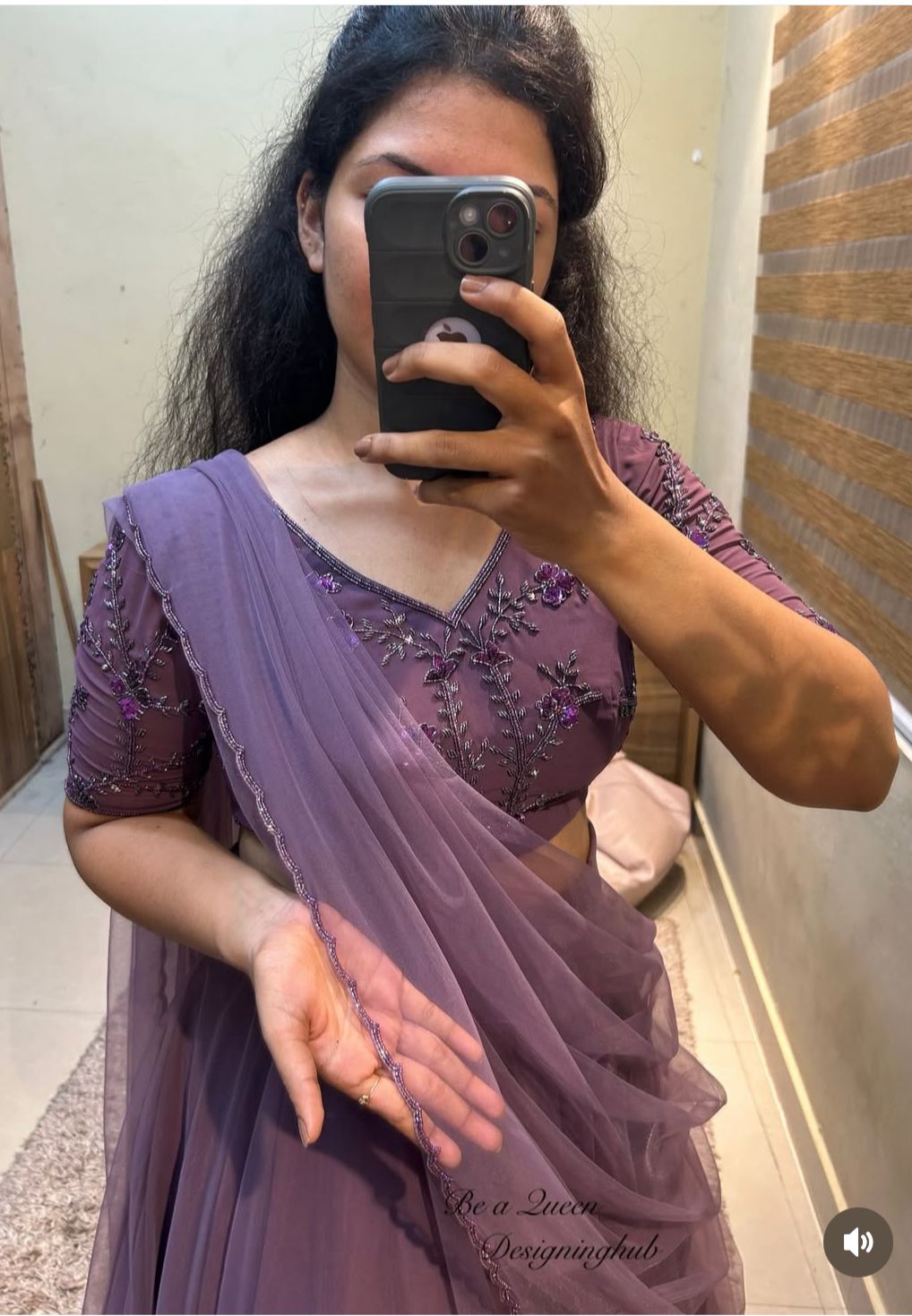 blouse piece with handwork: Georgette 1.25 mtr , skirt : net ; stitched with 5 mtr fabric ; with stiff net & 3 layers of lining