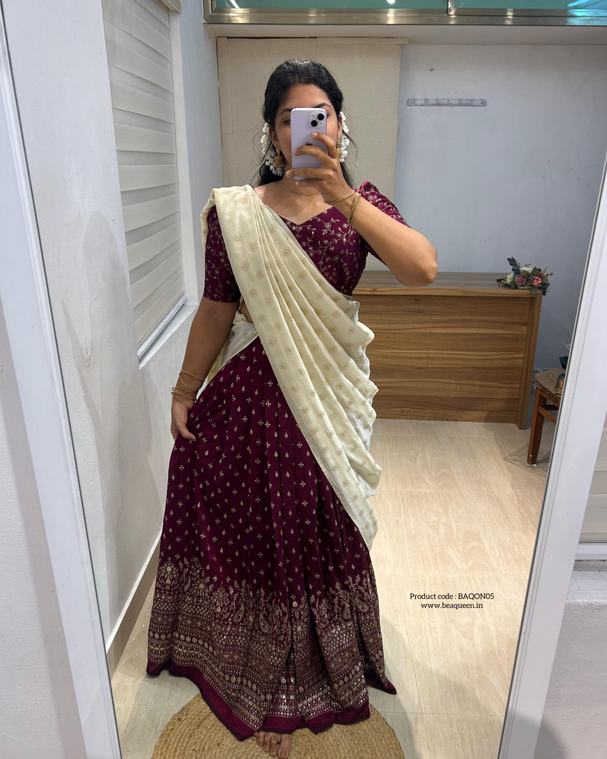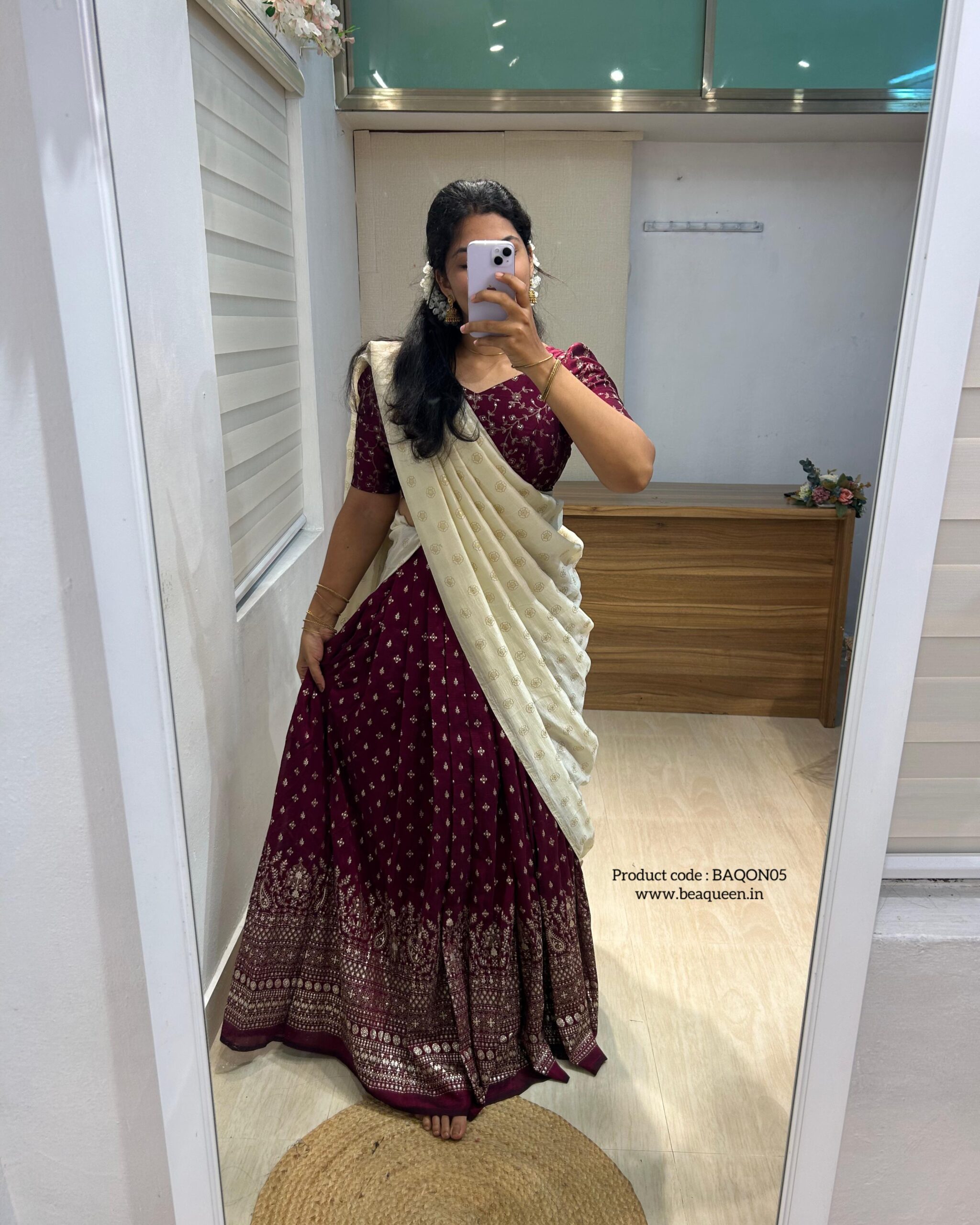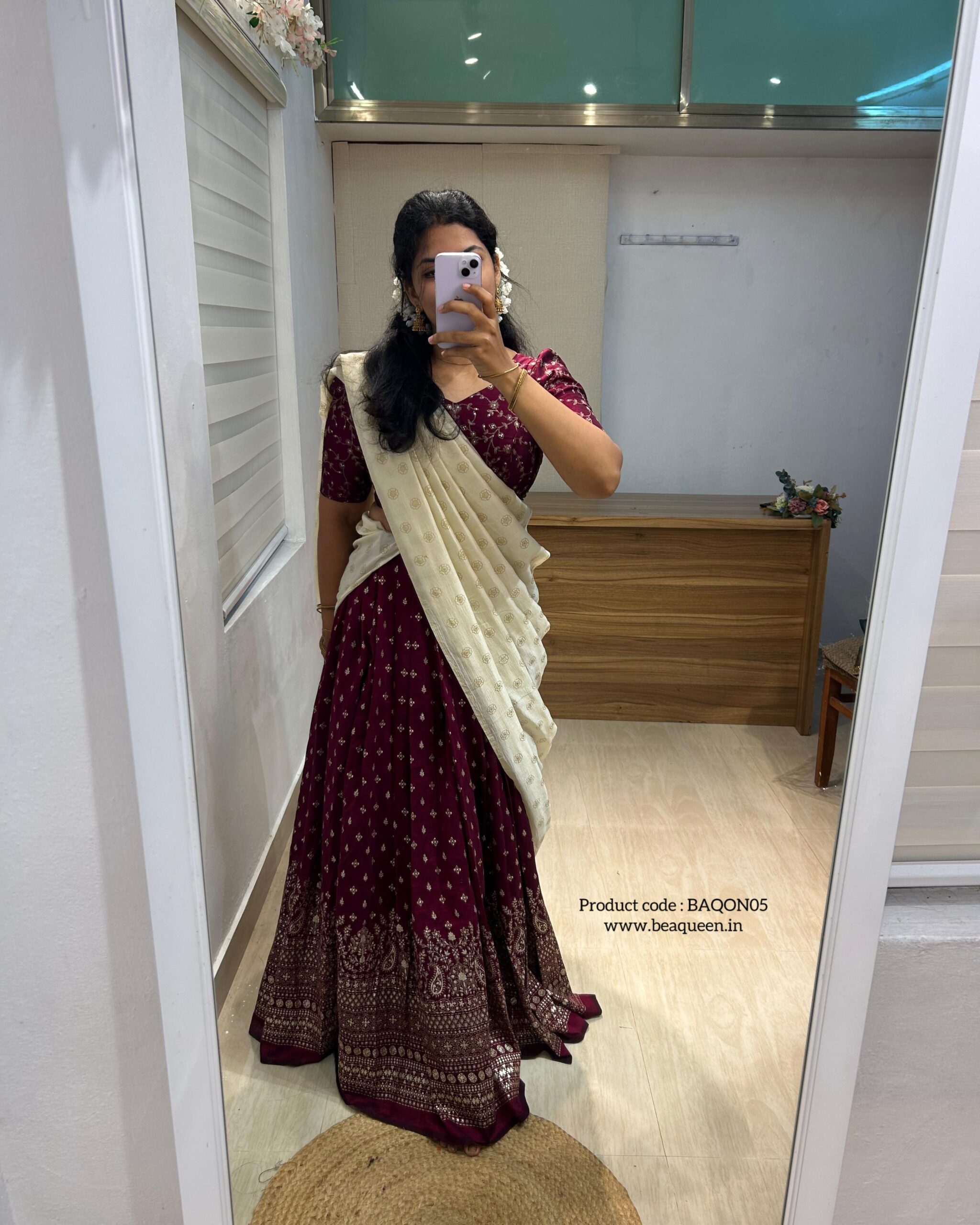 🌸ONAM SPECIAL HALF SAREE BEETROOT PURPLE- OFF WHITE COMBO 🌸