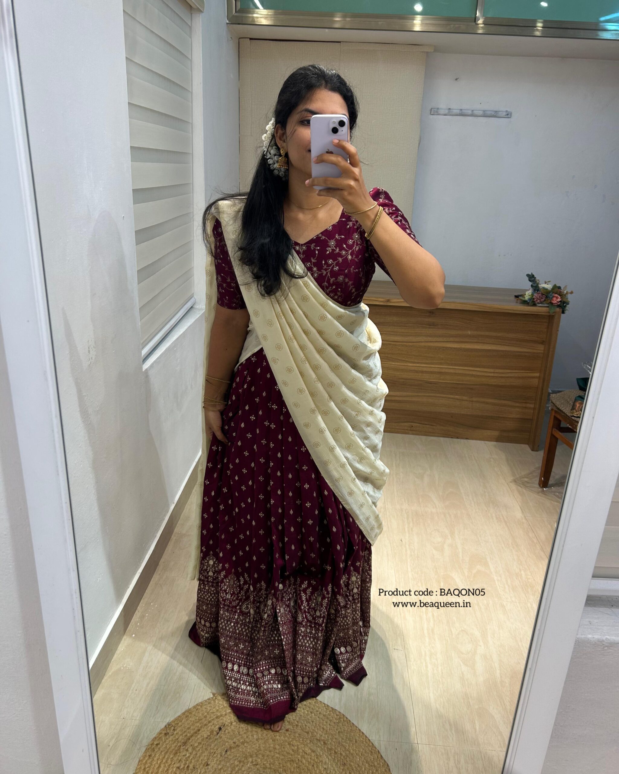 ONAM SPECIAL HALF SAREE BEETROOT PURPLE- OFF WHITE COMBO -BAQON05