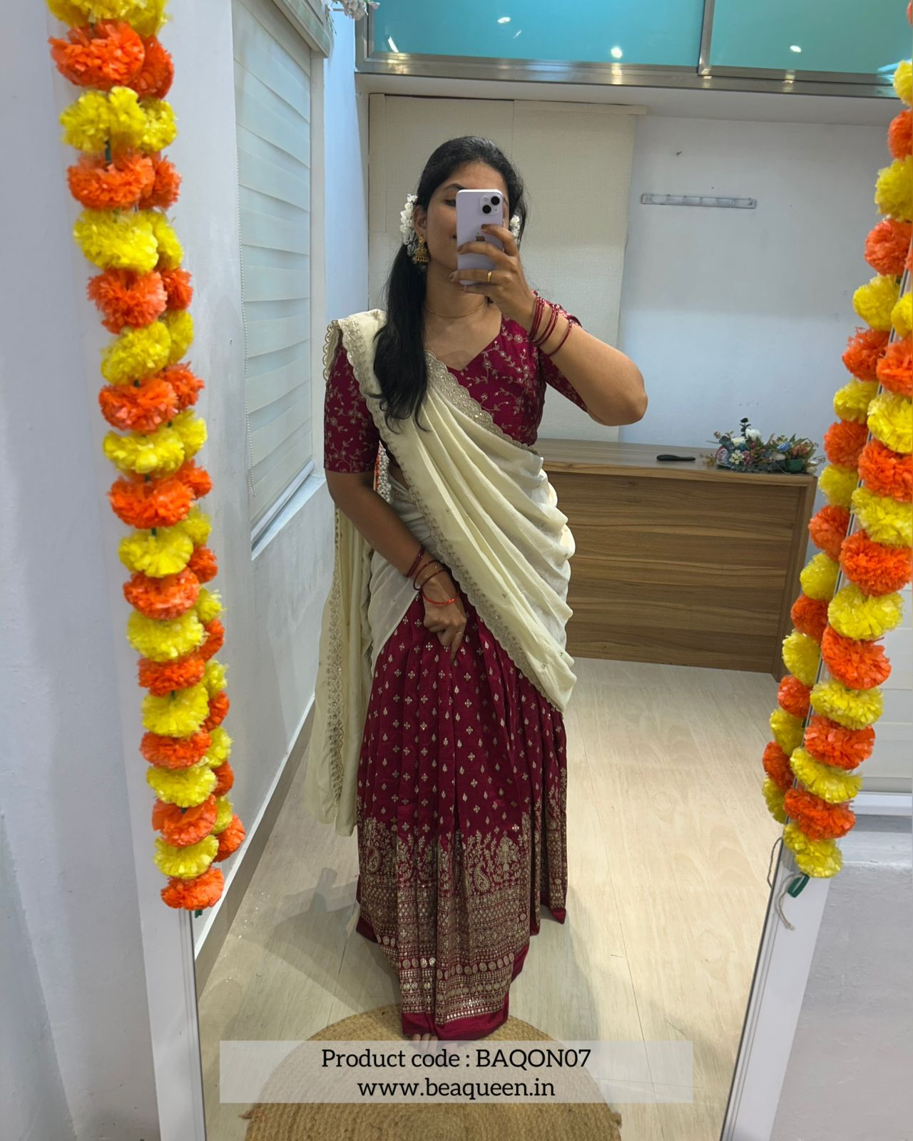 ONAM SPECIAL HALF SAREE IN OFF WHITE-MAJENTA PINK COMBO-BAQON07