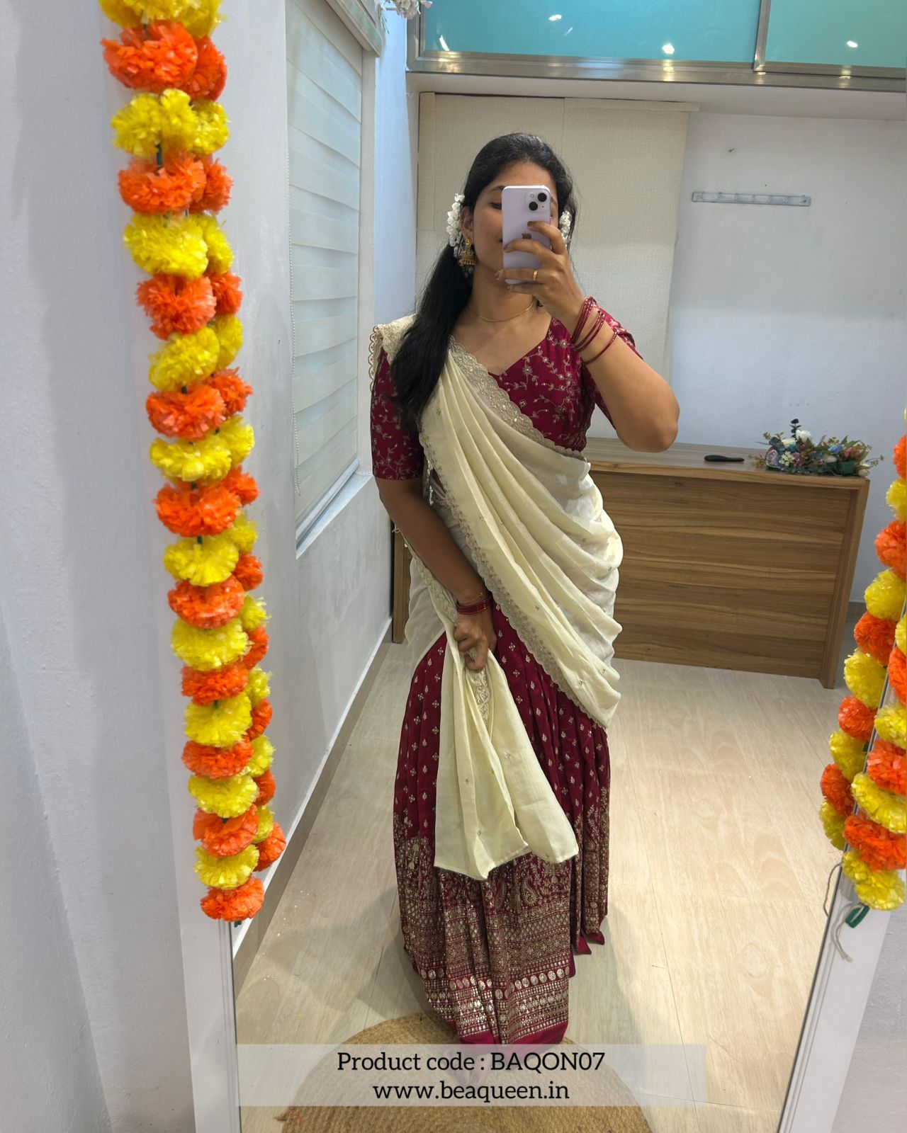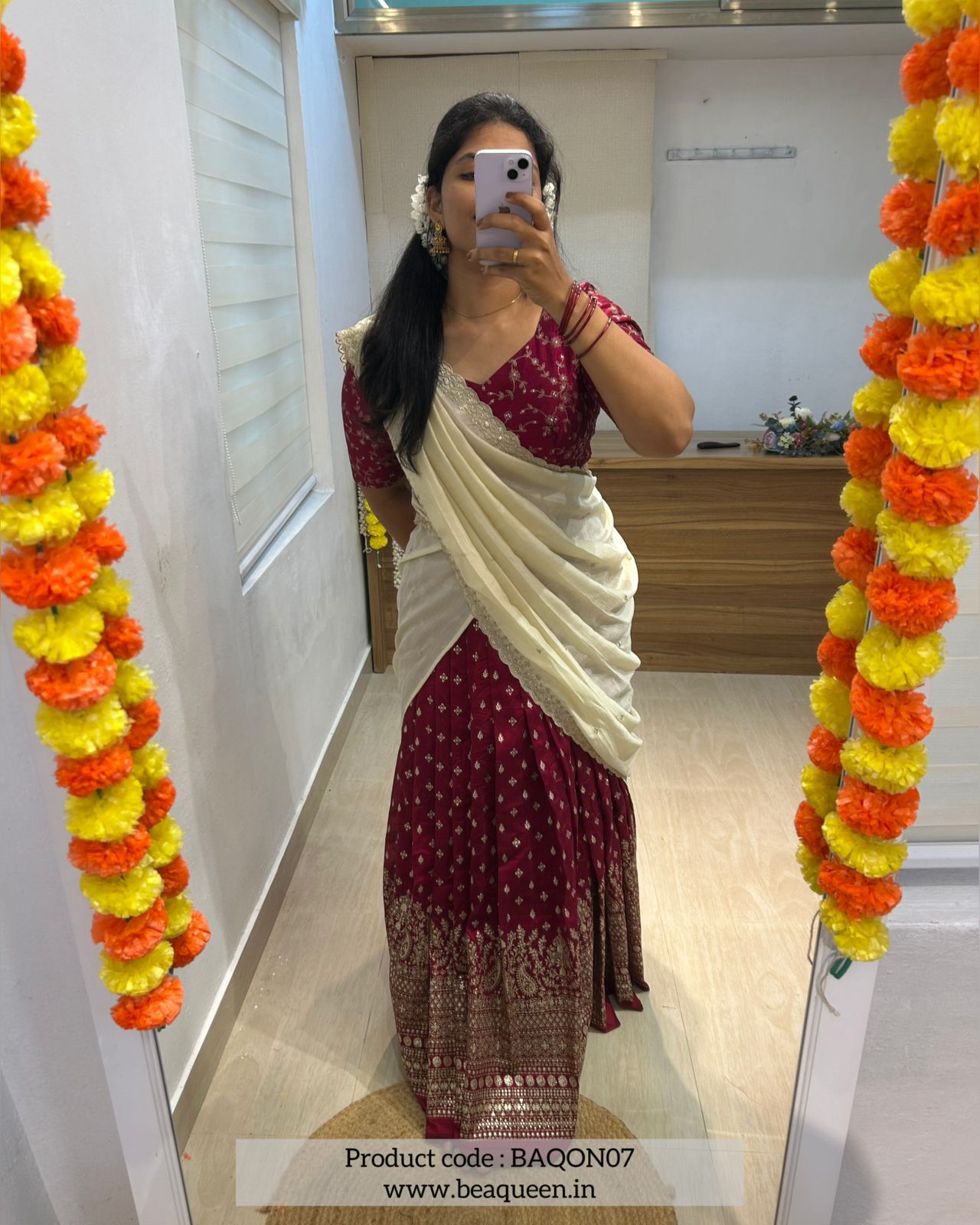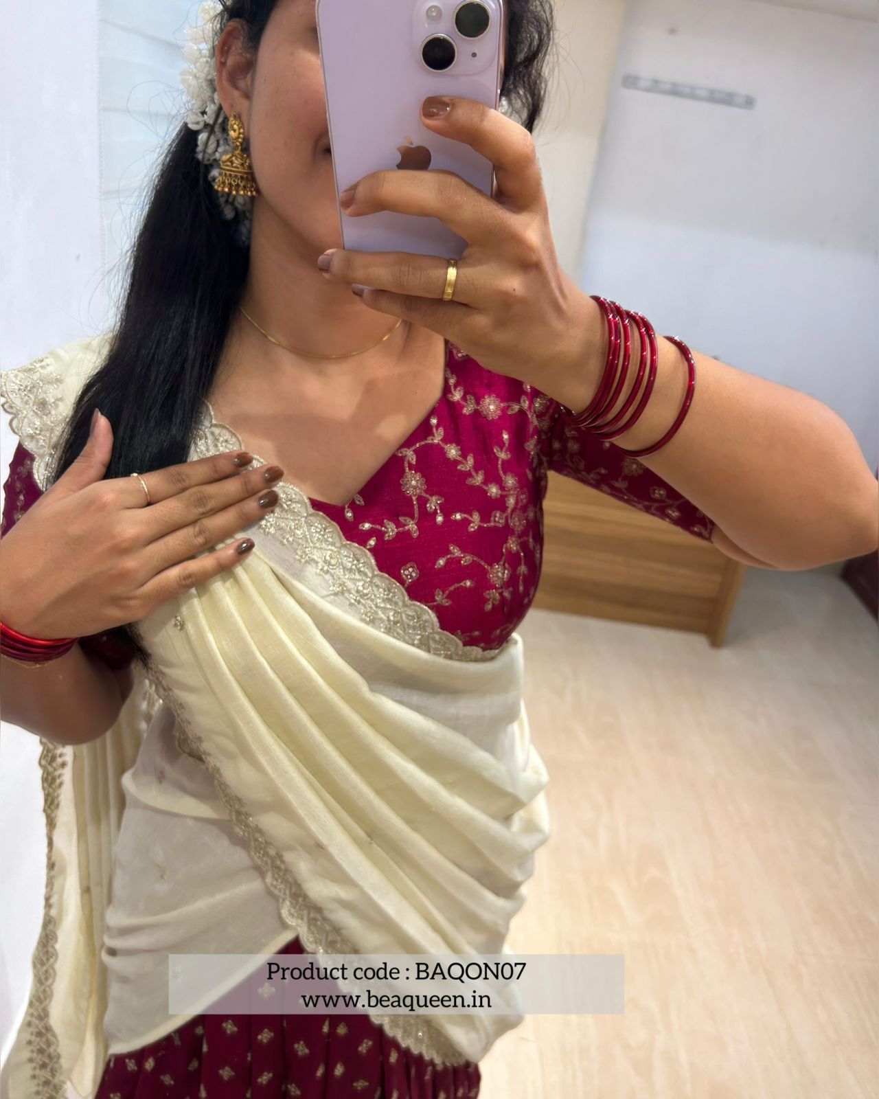 Be the first to review “ONAM SPECIAL HALF SAREE IN OFF WHITE-MAJENTA PINK COMBO-BAQON07”