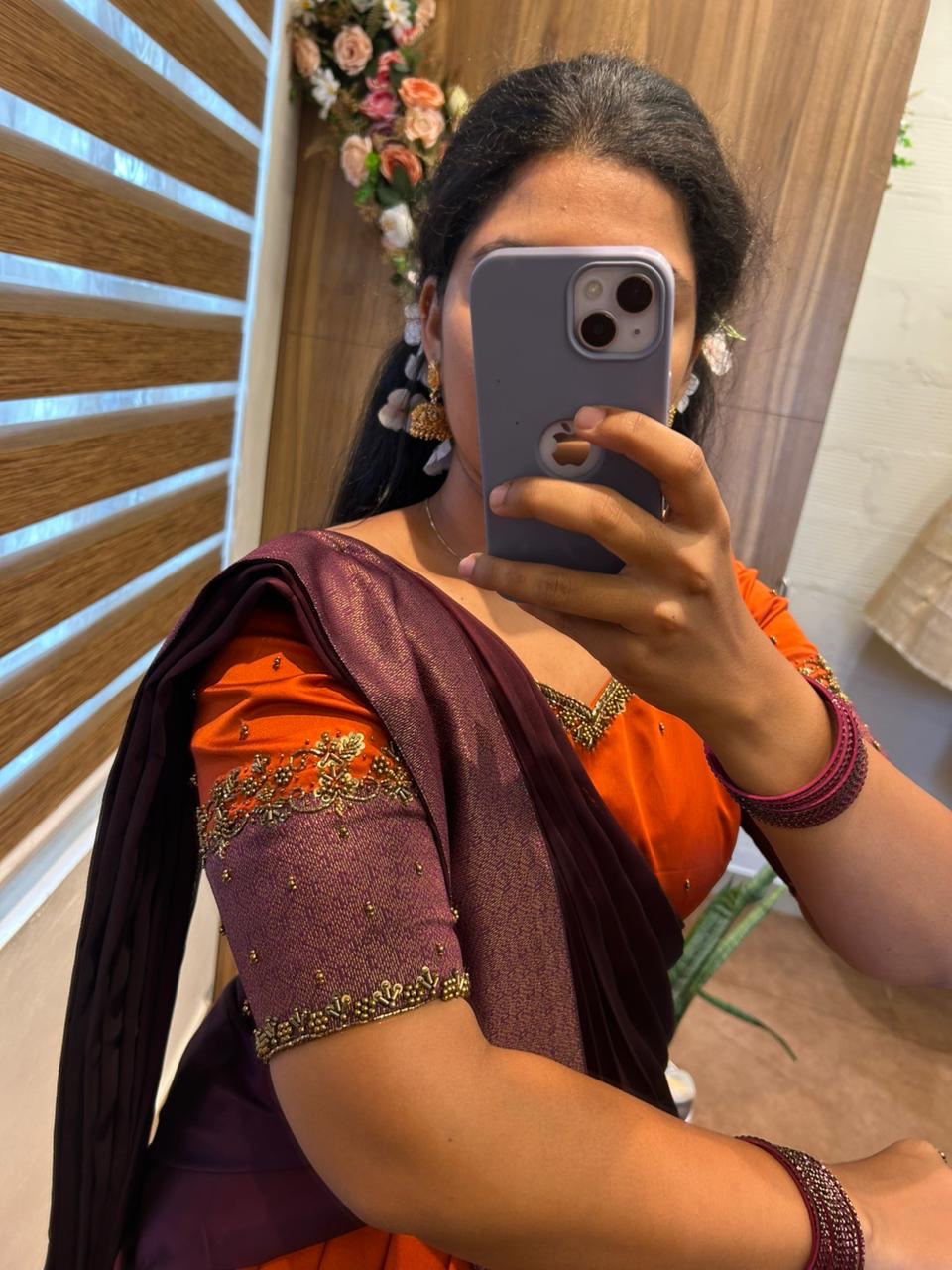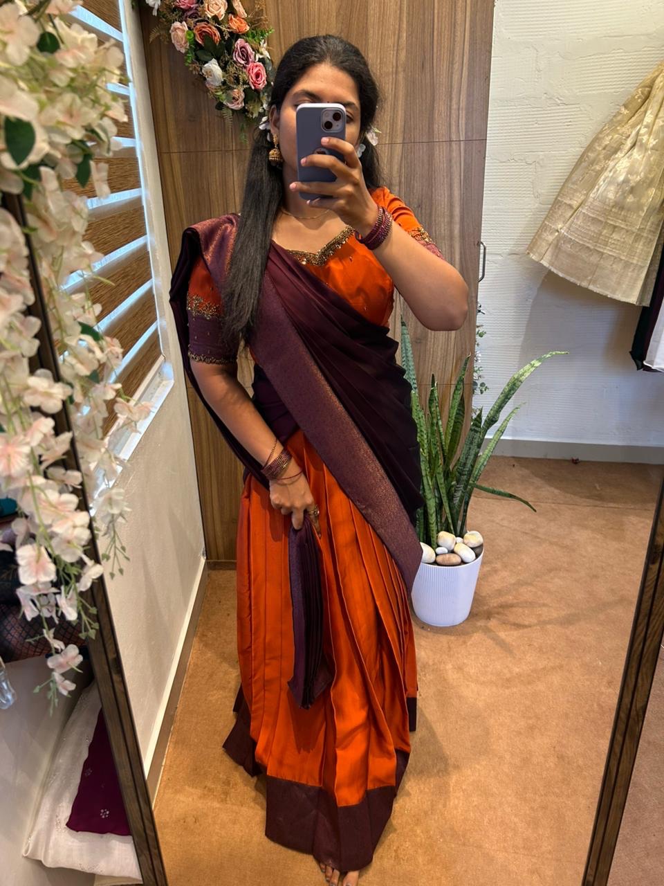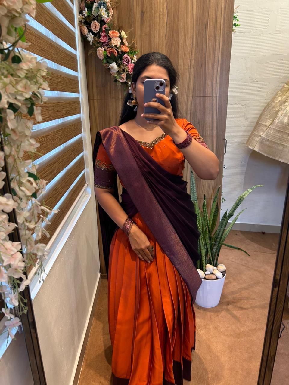 🌸TRADITIONAL HALF SAREE IN BURNT ORANGE – PURPLE COMBO 🌸