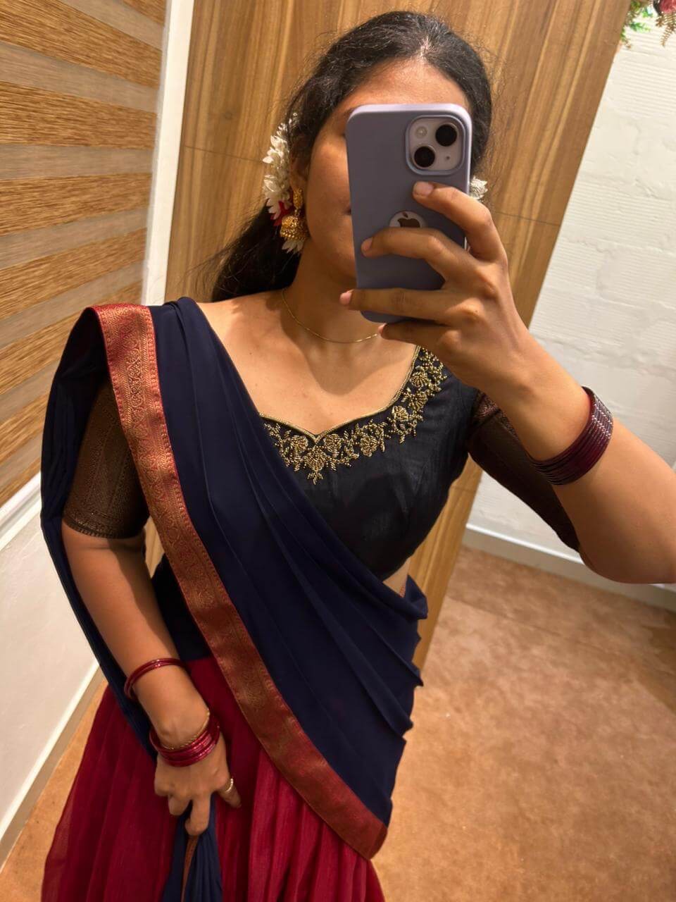 🌸TRADITIONAL HALF SAREE IN BURNT ORANGE – PURPLE COMBO 🌸