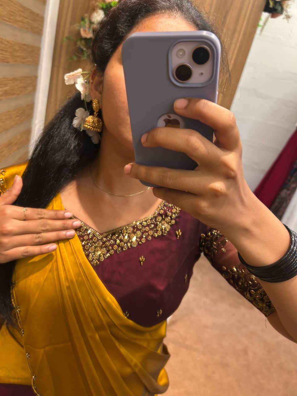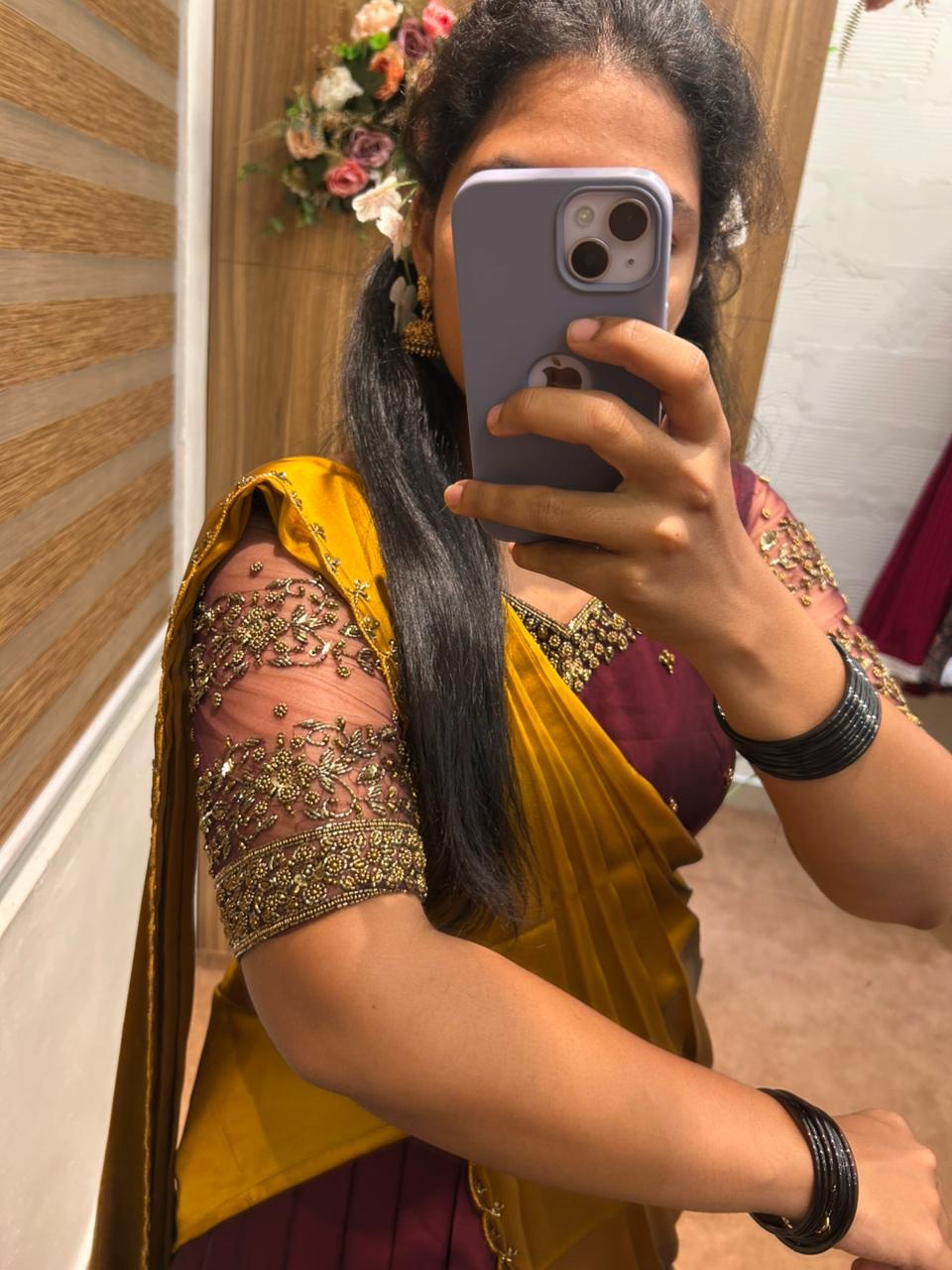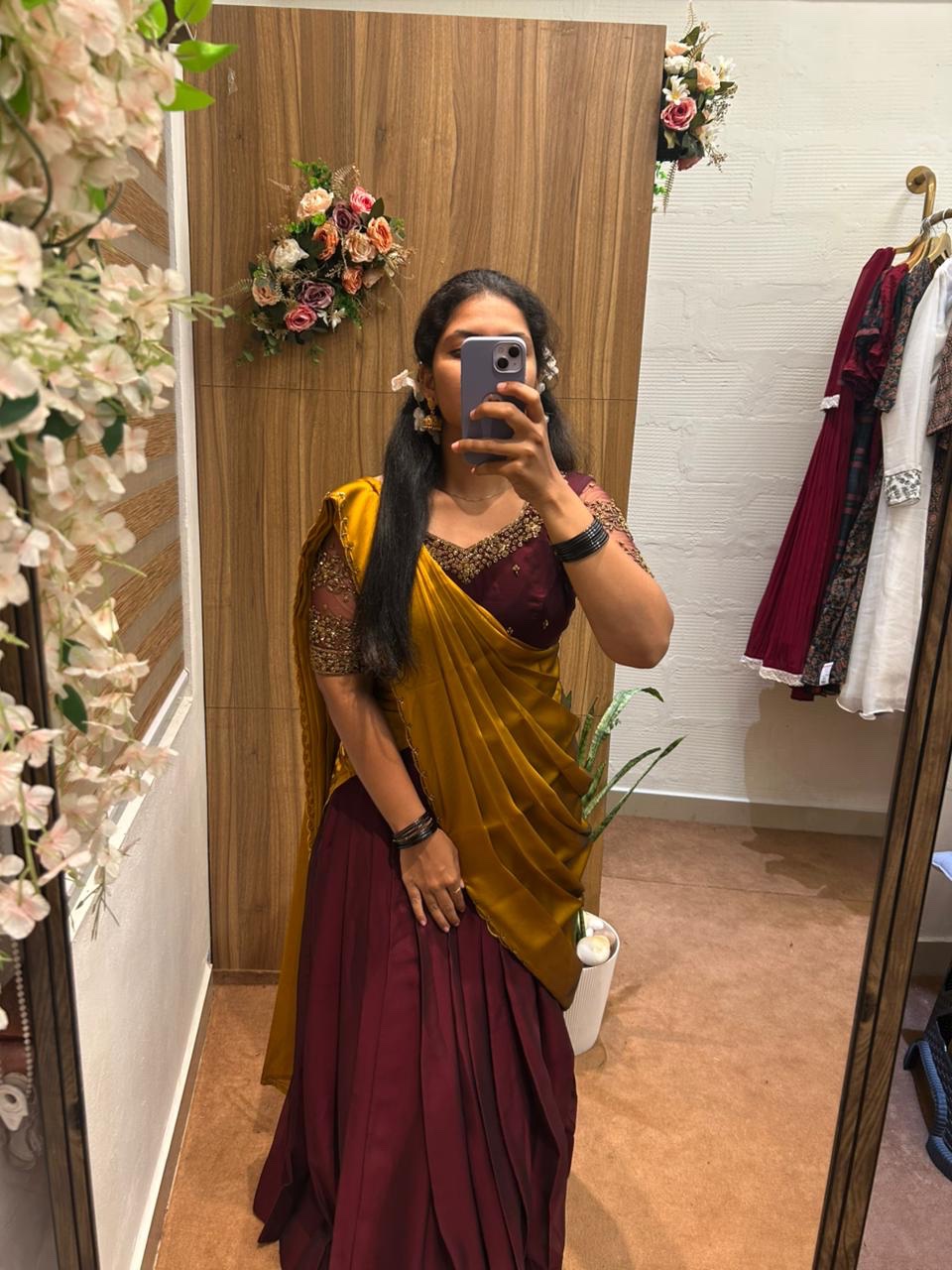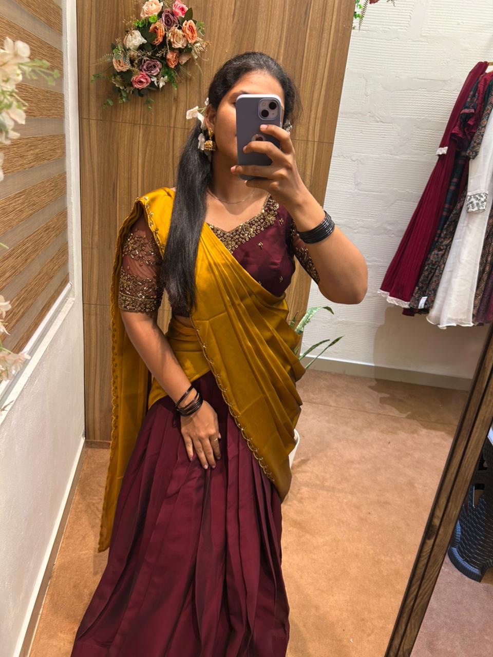 🌸TRADITIONAL HALF SAREE IN MAROON – GOLDEN YELLOW COMBO 🌸